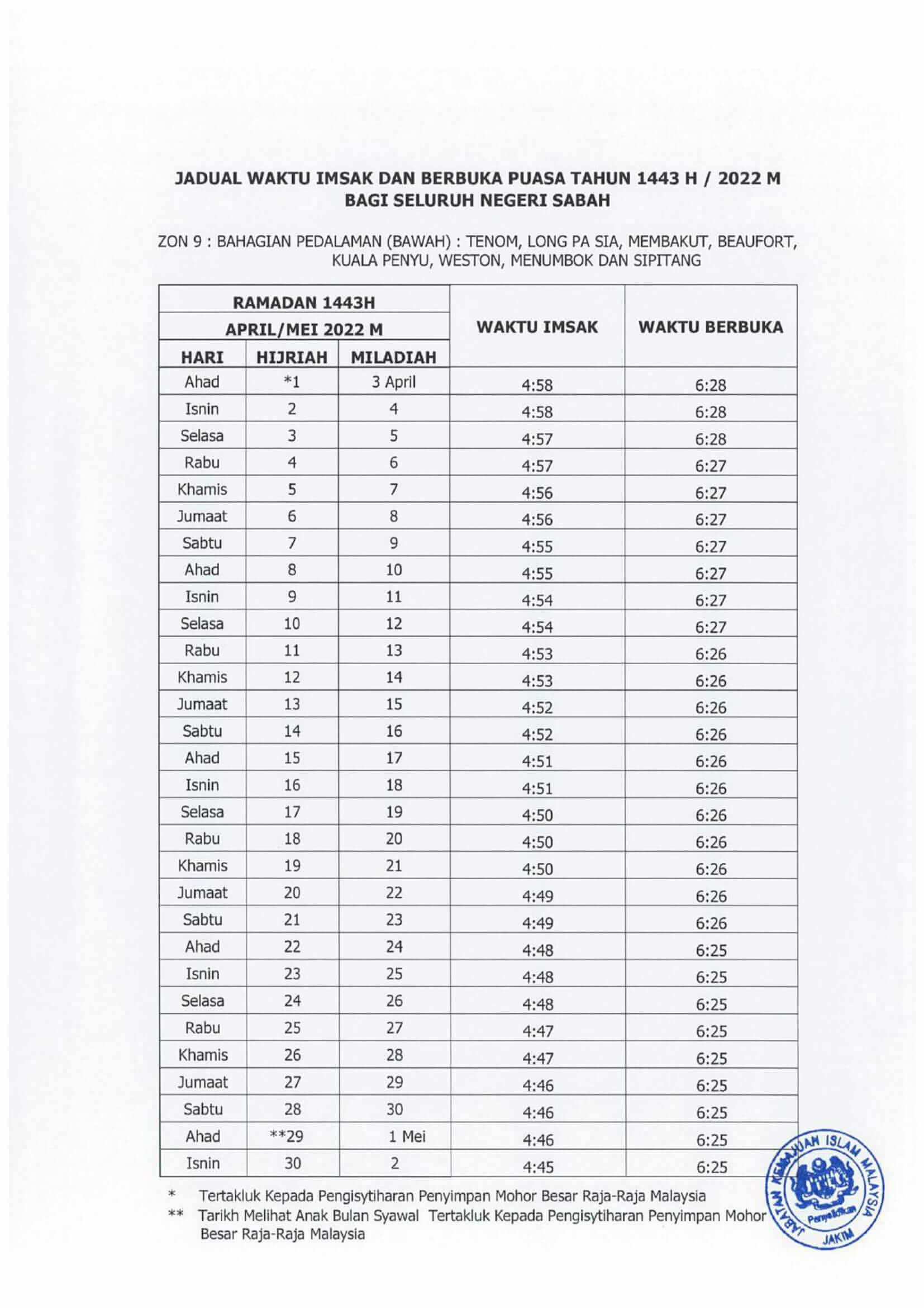 Bahagian pantai barat. Semoga lampiran jadual Waktu Imsak dan Berbuka Puasa bulan Ramadhan tahun 1443H 2022M yang disertakan dapat memudahkan umat Islam di negeri Sabah membuat semakan masa yang ideal untuk bersahur sebelum memasuki waktu Subuh selain dapat berbuka Puasa pada waktu yang tepat.